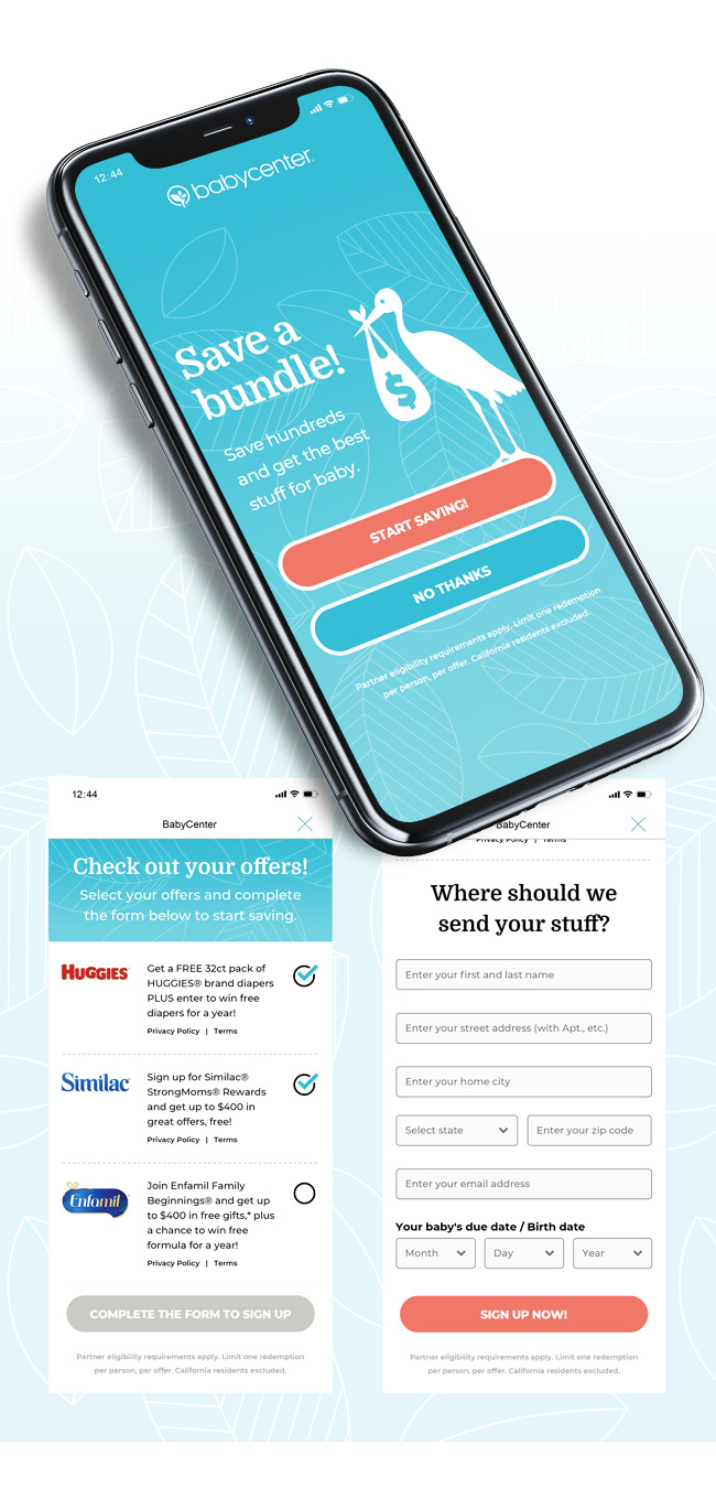 The "Multi-Partner Lead Gen" is an app-based interstitial, designed to allow multiple partners to collect contact information (100% opt-in) and present offers to our client base. (Think "welcome" boxes, coupons, etc., for expectant mothers.)