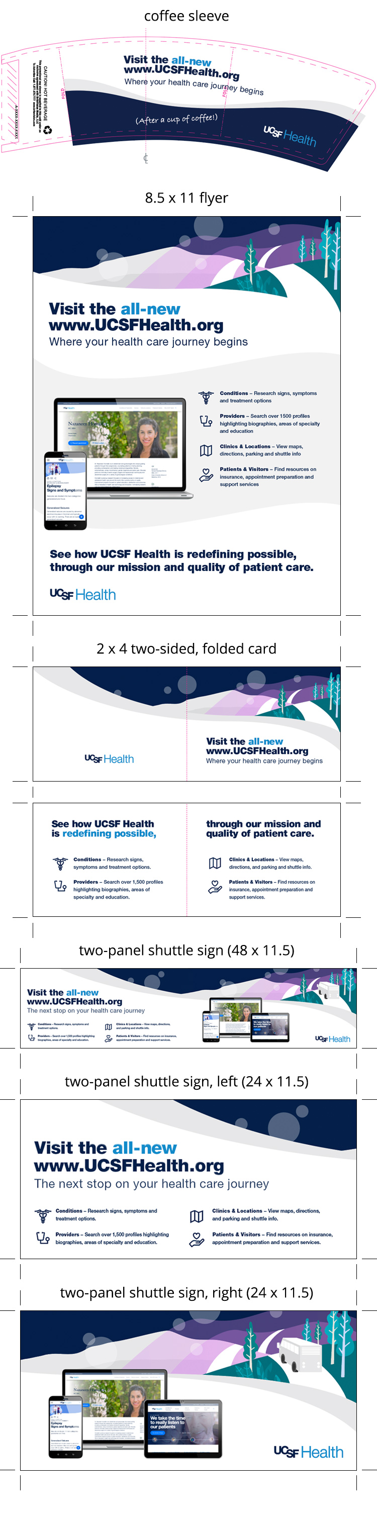 Taking design cues from the new site, these included flyers, folded cards that would be included in information packets, coffee sleeves and a two-part sign meant for placement inside the shuttle buses operated by UCSF